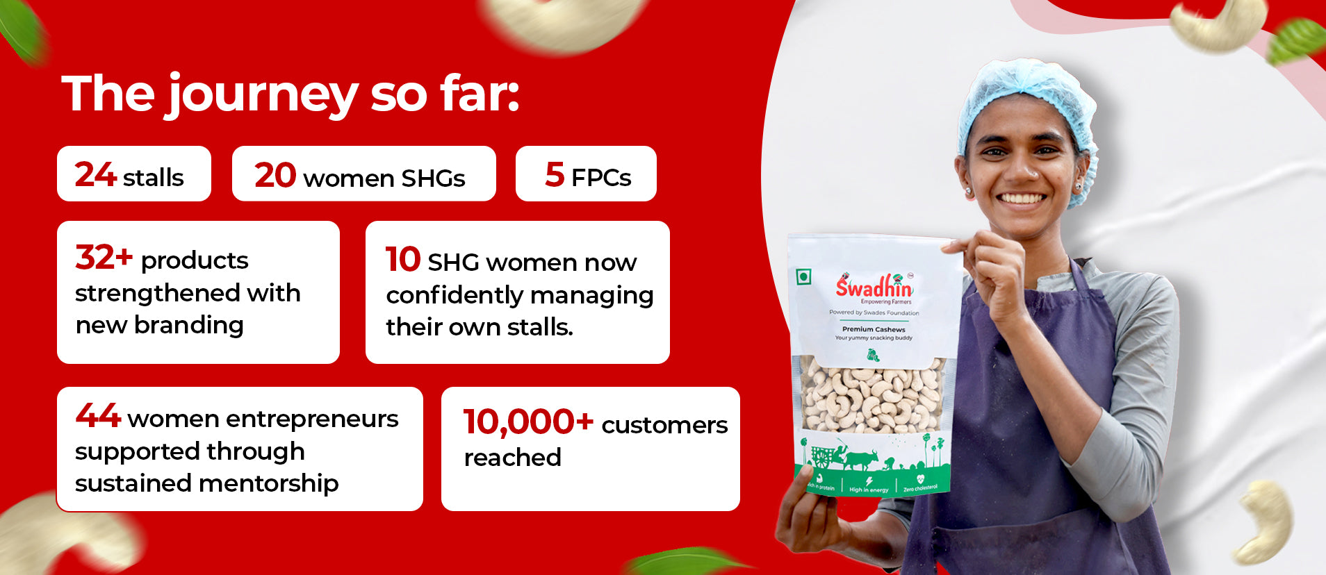 "I stay in California, everytime I go to India, I get back 10-15 packs of Swadhin Cashews. They are fresh, crunchy and the best cashews I have eaten. You know the best part, they are doing this to empower women."